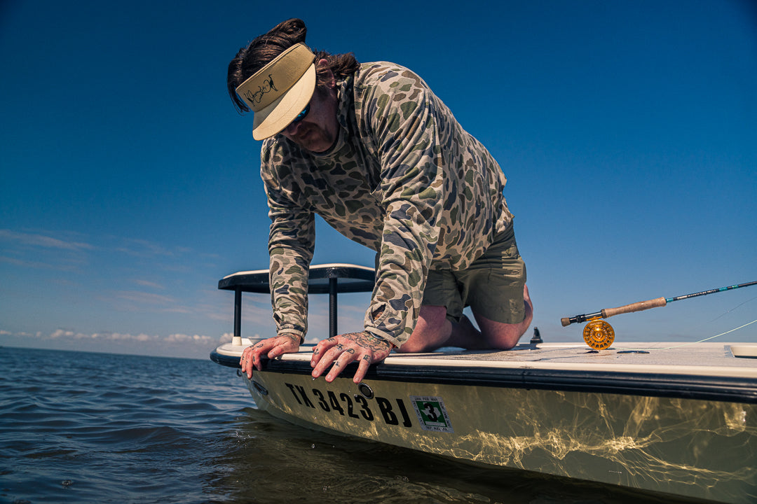 Light colored clothing and long sleeved SPF rated shirts and pants will help keep the sun off you and will limit having to reapply sunscreen. Hats, specifically with a dark or black under brim, will help you see better. Please wear non-marking shoes, but I recommend fishing shoeless so you can feel if you're standing on your line.